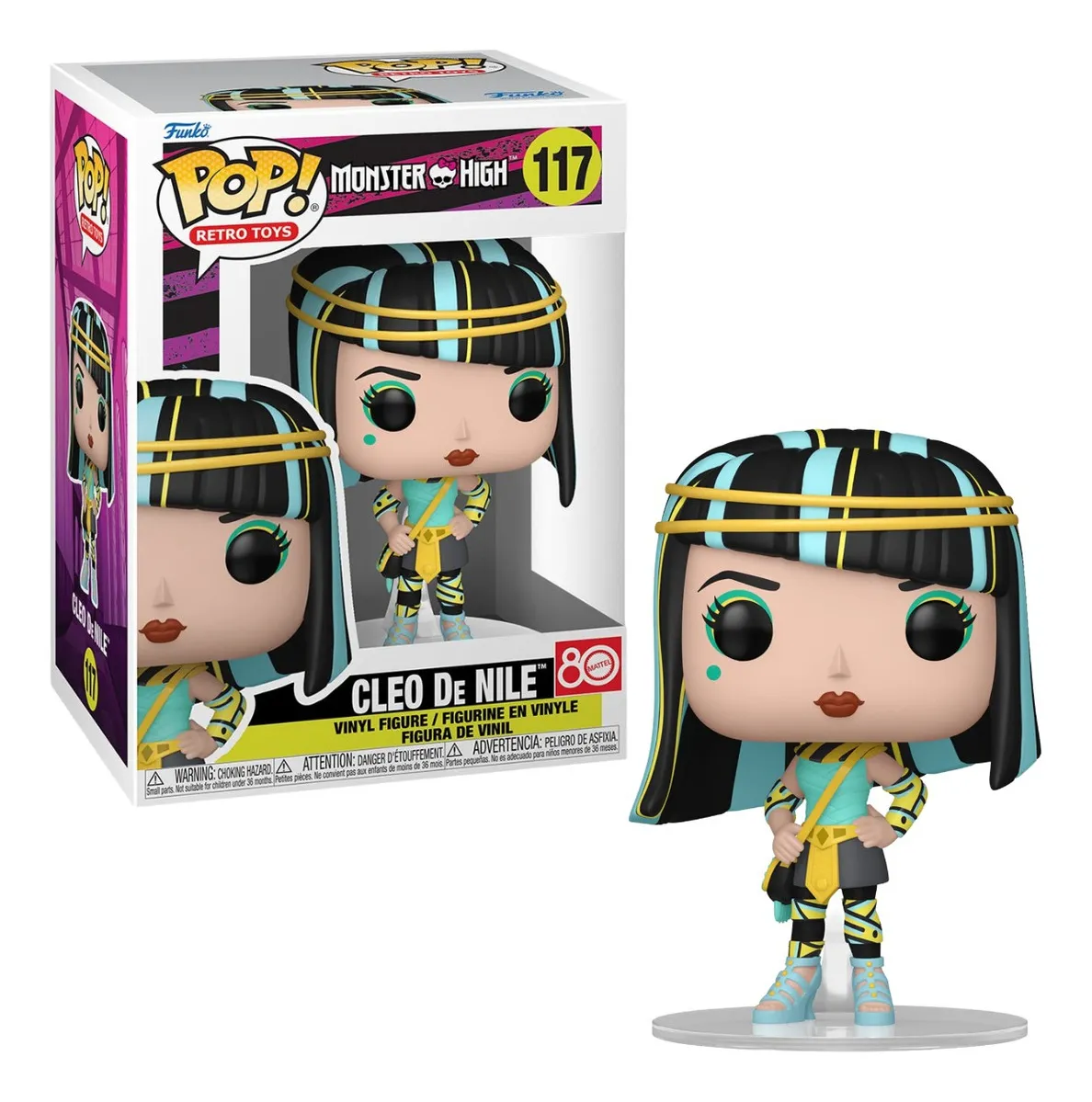 ¡La chica más popular, la capitana del equipo de fearleading y la diva por excelencia del instituto, la momia Cleo de Nile, llega con su figura coleccionable! Presentamos el FUNKO POP! CLEO DE NILE #117 de MONSTER HIGH!